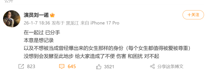 刘一诺发文回应:“在一起过,已分手,本意是想记录,以及不想被当成曾经爆出来的女生那样的身份(每个女生都值得被爱被尊重,没想到会发酵至此地步,给大家造成了不便、伤害和困扰,对不起。”
